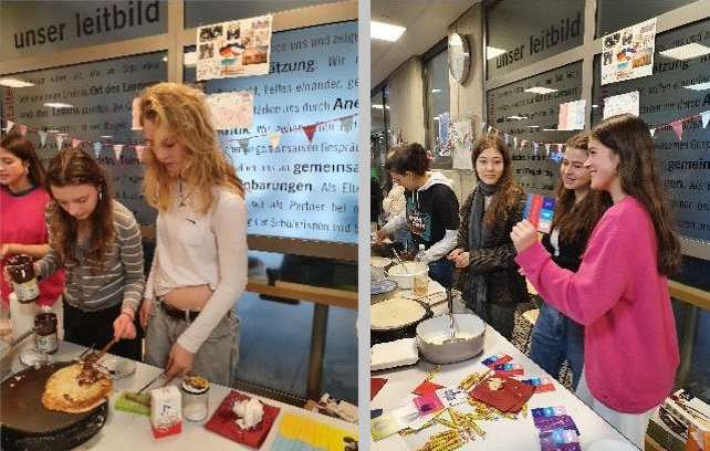 Der Französischkurs der Kursstufe 1 Frau Böhm hatte einen Stand gestaltet, wo es neben leckeren Crêpes und typisch französischen Süßigkeiten auch Infomaterial zur deutsch-französischen Beziehung und kleine praktische Werbegeschenke gab wie z.B. Miniwörterbücher für die Hosentasche oder Konjugationsscheiben zum Trainieren der französischen Verben.