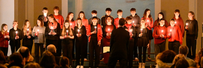 Der Mittelstufenchor unter Bernd Schlabach sorgte mit "Light a candle" und "Es kommt ein Schiff geladen" für adventliche und mit "Snowman" für schwungvolle Momente, während Ilia Wößner und Berk Hyuseinov (beide 10d) mit ihrem emotionalen Thema aus "Schindlers Liste" die Zuhörerinnen und Zuhörer berührten.