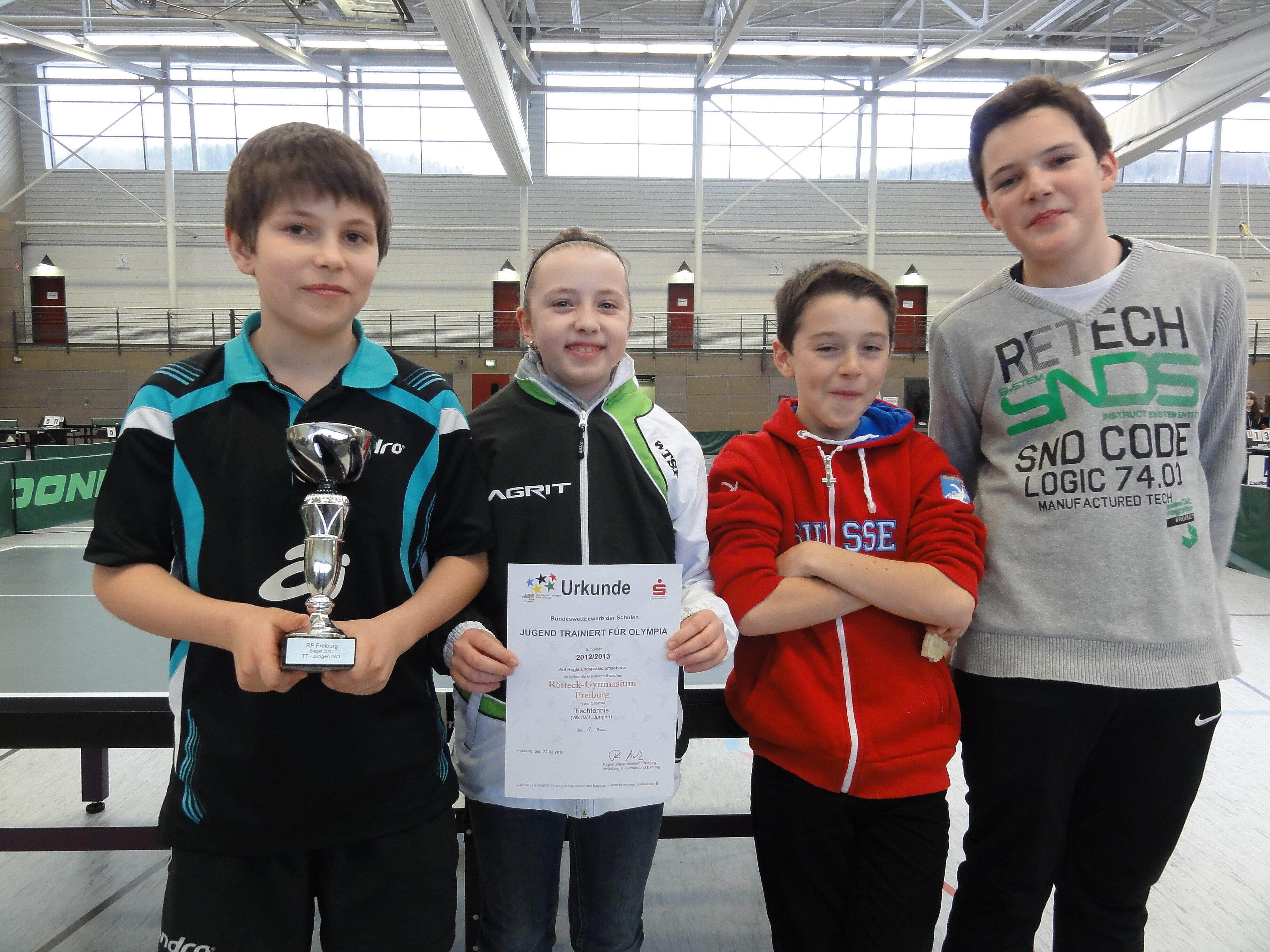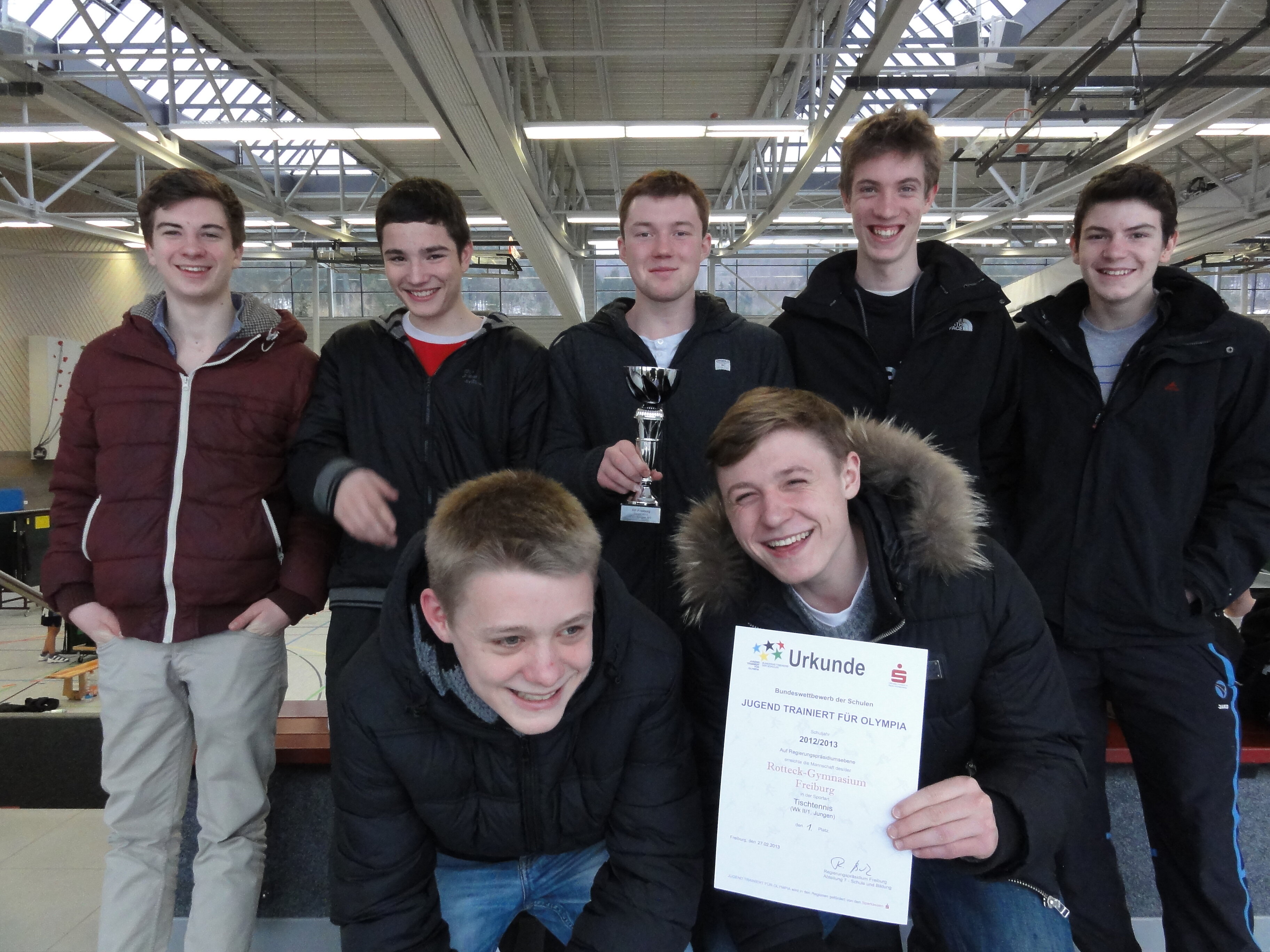 Wir schreiben das Jahr 2013. Am heutigen Tage, 27.02, ging es um die Qualifikation zum Landesfinale in der Disziplin Tischtennis. Für das Rotteck-Gymnasium Freiburg gingen an dem Austragungsort Blumberg in der Wettkampfklasse II/1 die Spieler Maikel Sauer, Lukas Luchner, Pierre Kolbinger, Niclas Hug, Jonathan Herden und Julian Kälber an den Start. Betreut wurde das eben genannte Team von dem sportbegeisterten und ebenfalls Tischtennis spielenden Herrn Becker, welcher wichtige mentale Tipps sowie spielerisch kluge Züge gab. Unterstützung erhielt er von seinem Assistenten Jason Plog, welcher letztes Jahr noch engagiert dem Team als Spieler zur Verfügung stand. Das stark aufspielende Team des Rotteck-Gymnasiums konnte sich in drei unglaublich spannenden und fesselnden Spielen gegen ihre Konkurrenten aus ganz Südbaden durchsetzten und sicherte sich den ersehnten ersten Platz. Doch nach Aussagen der Spieler sollte dieser Erfolg noch nicht das Ende ihrer Jugend trainiert für Olympia Reise sein. Das Ziel besteht dieses Jahr nämlich, wie in den vergangenen zwei Jahren, in dem Erreichen des Bundesfinales, welches in Berlin ausgetragen wird. Wir wünschen dem Team weiterhin viel Erfolg und Glück und hoffen, dass das Team sein Ziel erreichen kann.
