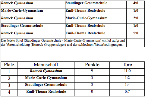 Im letzten Spiel des Tages traf das Rotteck im Lokalderby auf die Emil-Thoma-Realschule. Das Endergebnis von 5:0 (Lukas Metzinger 2x, Kolja Herrmann, Christian „Backe“ Strecker, Freddy Polzer) verwunderte nicht wirklich, da die Mannschaft zum einen weiterhin attraktiven Fußball mit tollen Toren zelebrierte, zum anderen die Einstellung der bereits ausgeschiedenen Emil-Thoma-Schule teils an Leistungsverweigerung grenzte. Dies passte auch zu der teils unfairen Spielweise einiger Realschüler.