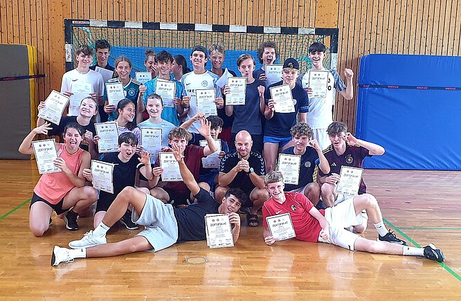 Eine intensive Woche in der Sportschule Steinbach bei Baden-Baden mit intensiven Theorie- und Praxisinhalten führte nach erfolgreich gehaltenen Lehrproben aller Beteiligten zum erhofften offiziellen Zertifikat, das sich in jedem Lebenslauf gut macht und den Weg zur C-Lizenz deutlich verkürzt. Damit wurden auch 3 Jahre Sportprofil quasi gekrönt.