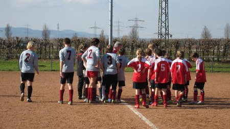 Leider hatten zwei der vier Mannschaften noch kurzfristig abgesagt, so dass nur noch zwei Mannschaften angetreten waren. So vereinbarte man ein Spiel über insgesamt 70 Minuten, um allen Teilnehmern genügend Spielzeit zu ermöglichen. Dabei stellte sich heraus, dass die gegnerische Mannschaft fast ausschließlich aus Spielern des Jahrgangs 96 bestanden, während bei unserem Team 60 % aus dem 98-Jahrgang stammten und der Rest aus dem Jahrgang 97 war. Die Größenunterschiede waren dadurch so immens, dass unsere Spieler i.d.R. mindestens 1 bis 2 Köpfe kleiner waren als die Gegenspieler. Da die gegnerische Mannschaft ihre körperliche Überlegenheit auch mit einem sehr robusten Spiel unterstrich und leider der Schiedsrichter (in der ersten Halbzeit der Lehrer der gegnerischen Mannschaft) dieses sehr harte Spiel nicht unterband, wurde unseren Jungs (und auch zwei Mädchen) hier erst mal etwas der Schneid abgekauft. Nachdem sich die Gemüter etwas erhitzt hatten, stand es dann relativ schnell 0:3 für die andere Mannschaft.