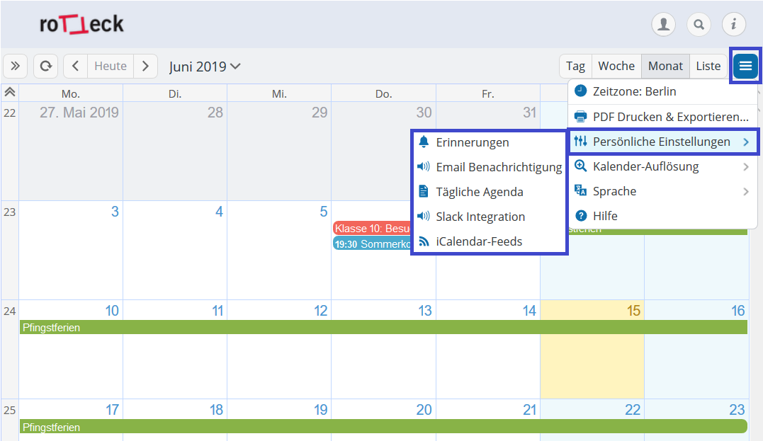 Darüber hinaus besteht die Möglichkeit, alle oder einzelne Unterkalender sowie einzelne Termine des Schulkalenders per iCal-Feed von anderen Kalender-Apps (z.B. Google- oder Outlook-Kalender) abonnieren zu lassen (=> s. Punkt “Einstellungen”).