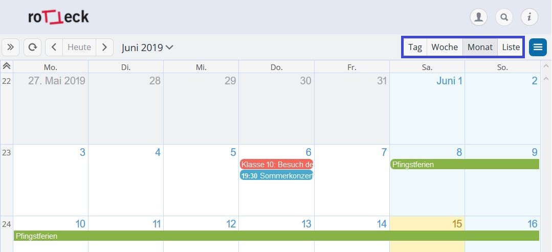 Zur Darstellung des Kalenders können Sie auf drei verschiedene Ansichten zugreifen: