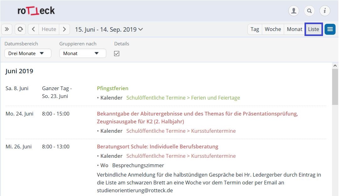 Sie können sich die Termine in kalendarischem Format nach Tag, Woche oder Monat anzeigen lassen. Außerdem besteht die Möglichkeit, sie in Listenform - chronologisch sortiert und untereinander - darzustellen.