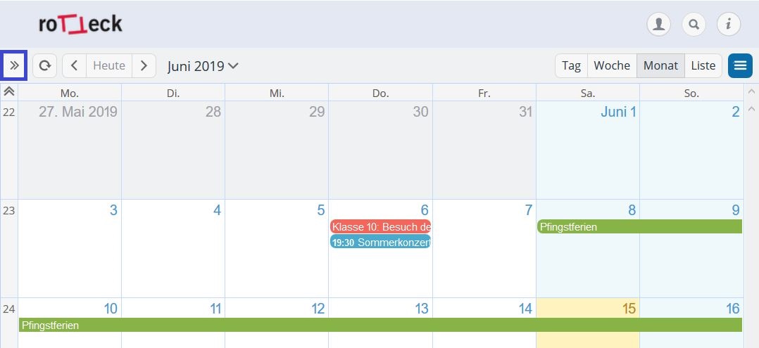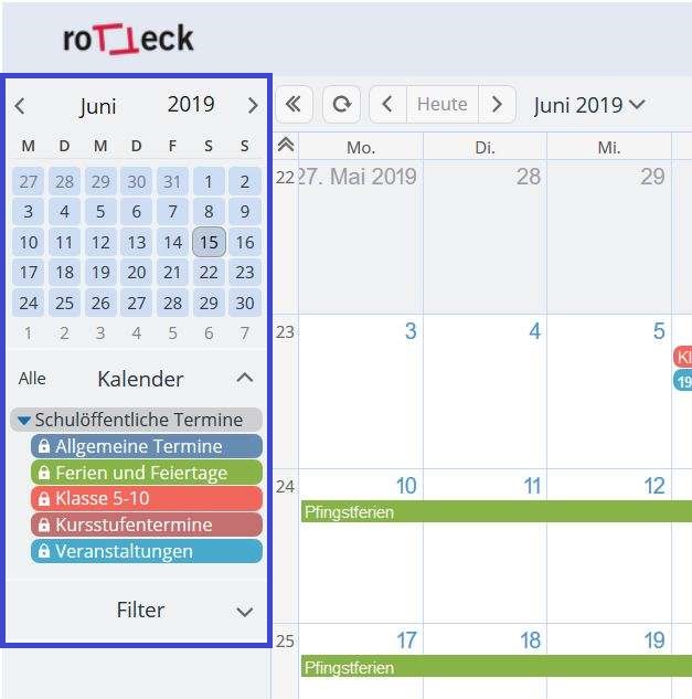 - Anzeige der fünf Unterkalender für schulöffentliche Termine und des Unterkalenders für interne Termine (durch Anklicken lassen sich die Termine des jeweiligen Unterkalenders aus- oder einblenden)