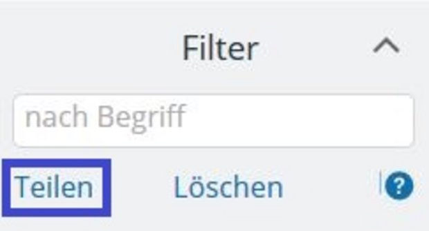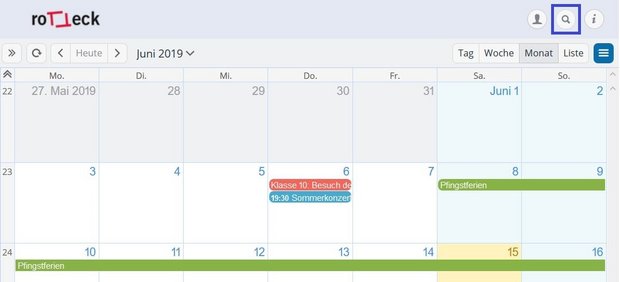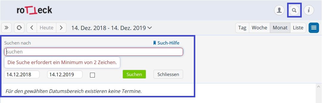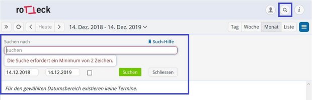 Im Unterschied zur Filterfunktion in der Kontrollspalte, die nur die aktuelle Bildschirmansicht eingrenzt, besteht auch die Möglichkeit, den gesamten Kalender zu durchsuchen. Die Suchfunktion können Sie rechts oben im Kalender aufrufen: