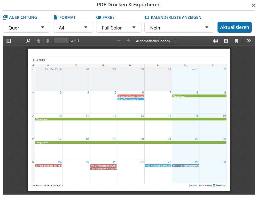 - iCalendar-Feeds: Sie können für jeden Unterkalender einen iCal-Feedlink erzeugen (z.B. einen Feed für "Allgemeine Termine", der dann so aussieht: “https://ics.teamup.com/feed/ksxpexhgsexbwxyedb/6199596.ics”) und damit die Termine des Schulkalenders von anderen Kalendern (z.B. Google, Outlook) abonnieren und anzeigen lassen.
