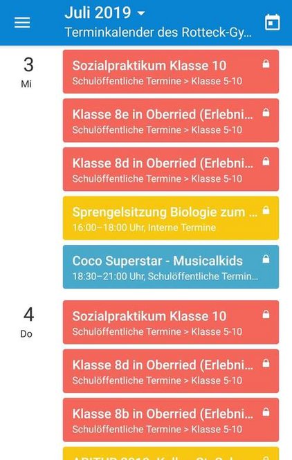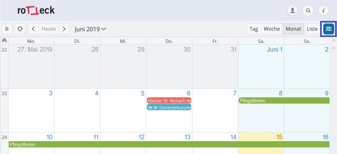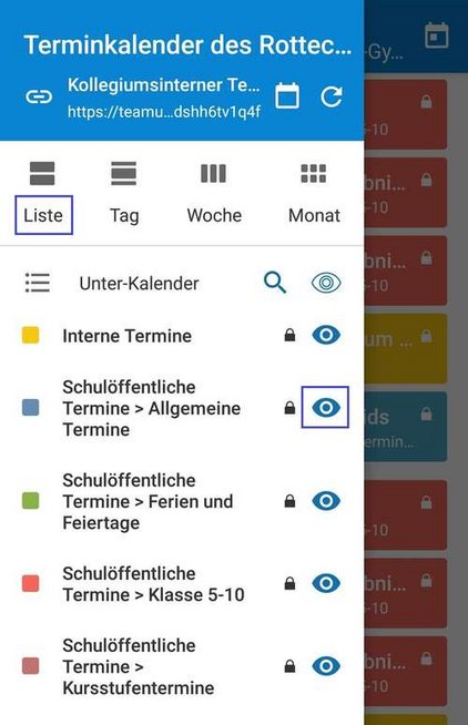 - Der Kalender ist nun verbunden. Oben links finden Sie das Menü-Icon (= drei weiße horizontale Balken), über das Sie die angezeigte Oberfläche anpassen können. Für kleine Bildschirme empfiehlt sich das Ansichtsformat "Liste". Über das rechtsseitige augenähnliche Icon im Menü können Sie die jeweiligen Unterkalender aus- bzw. einblenden.