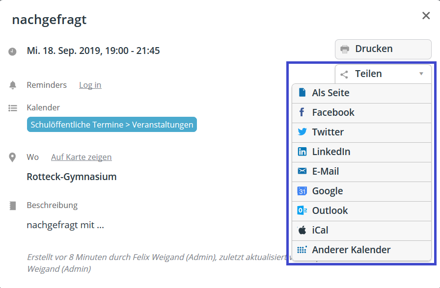 Durch Anklicken eines Termins gelangen Sie in dessen Detailansicht, die genauere Angaben wie den Ort und eine Beschreibung enthält. Dort haben Sie die Möglichkeit, den jeweiligen Termin auszudrucken bzw. als PDF-Datei lokal abzuspeichern oder ihn mit anderen zu teilen (über soziale Medien oder per iCal-Feed).