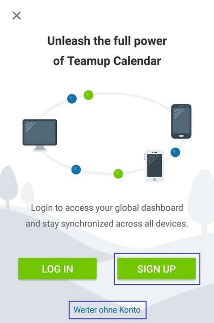 - Es besteht die Möglichkeit, einen kostenlosen Teamup-Account anzulegen ("Sign up") oder die App ohne Konto zu nutzen ("Weiter ohne Konto"). Ein eigener Account ermöglicht es Ihnen, die Reminder-Funktion zu nutzen (=> 7. Einstellungen), ein Profilbild hochzuladen und das App-Dashboard mit dem allgemeinen Web-Dashboard Ihres Teamup-Accounts zu synchronisieren; d.h. Sie können dann auch mithilfe der App alle Ihre genutzten Teamup-Kalender über verschiedene Endgeräte hinweg zentral verwalten und darauf zugreifen.