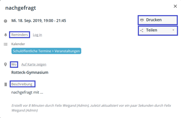 - Indem Sie einen Termin anklicken bzw. auswählen, gelangen Sie in die zugehörige Detailansicht, die alle (Zusatz-) Informationen zu diesem Termin enthält.
